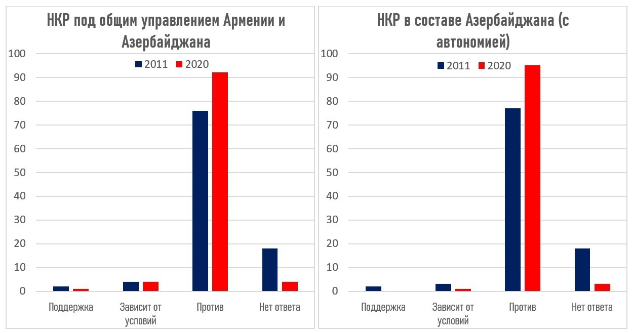 Потенциальный уровень поддержки решения конфликта в виде создания совместно управляемой административной единицы снизился, но куда сильнее выросло число противников такого решения – с 76% до 92%. Что касается сдачи Арцаха под контроль Азербайджана, то при определенных условиях такое решение готов поддержать сейчас всего лишь 1%, тогда как раньше таковых было 5%. Число противников этого выросло с 77% до 95%. В 2020 году в восприятии больше нет разницы между воспринимаемым вариантом «НК как автономия в составе Азербайджана» и «НК в составе Азербайджана без автономного статуса», что отражает нулевой уровень доверия к Азербайджану, чья автономия не воспринимается эффективной.