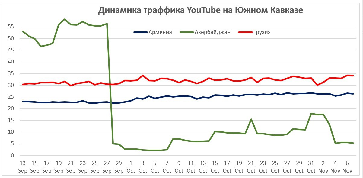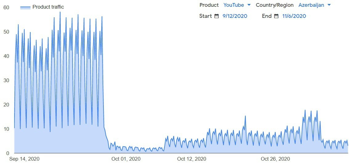 Радикальные изменения фиксируются и в потреблении контента в YouTube. В Азербайджане потребление медиа-контента упало в 11 раз, а на пике – в 25 раз или на 96%.
