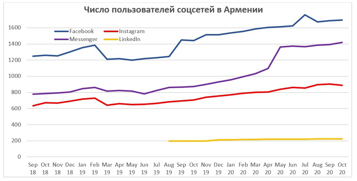 График 10. Динамика распространенности ряда соцсетей в Армении по числу пользователей