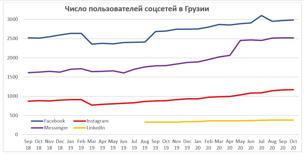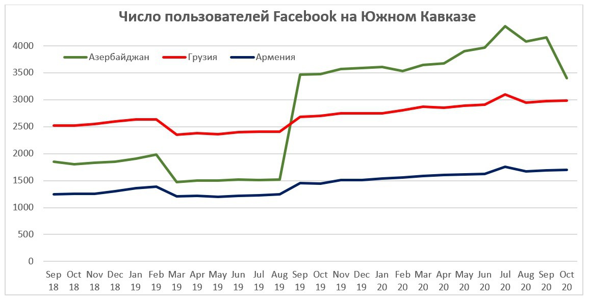 При этом, согласно Internet World Stats, в Армении 2.1 млн юзеров, а в Азербайджане – 8 млн юзеров интернета. Эти же данные представлены самими национальными службами и в Азербайджане они сфальсифицированы напару с демографическими. При этом, если в Грузии проникновение интернета – 2/3 населения или 2.6 млн человек, что фактически меньше числа активных пользователей Фейсбука из Грузии или соответствует ему, если считать что оценка численности интернет-пользователей могла устареть. Это может объясняться также тем, что платформа считает абхазов и осетин вместе с грузинами.