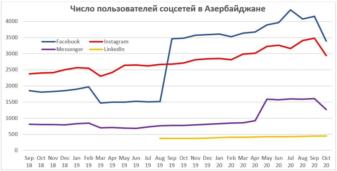 Блокировка соцсетей заметна и при взгляде на число всех пользователей той или иной соцсети по странам. В частности, по странам Южного Кавказа доступна статистика динамики соцсетей за последние два года. По Азербайджану, как и в других графиках, видны резкие и не всегда объяснимые колебания. Все цифры на графиках – в тысячах человек.