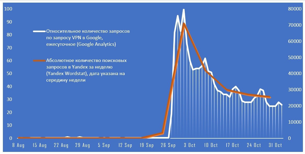 За период с 27 сентября по 1 ноября 2020 года в Азербайджане было сделано 199.5 тыс. запросов со словом VPN по Яндексу. При этом, динамика запросов в Yandex и Google идентична. Поскольку по данным StatCounter-а, в сентябре-октябре в Азербайджане 95.43% поисковых запросов приходится на Google, а 2.61% - на Yandex, можно предположить, что в Google было сделано еще 7.3, а всего 7.5 млн запросов, содержащих VPN, что означает, что большое количество пользователей, сопоставимое со всей интернет-популяцией, искали это слово 1 или более раз (для выбора сервиса и установки приложения средний пользователь, скорее всего, будет делать поиск много раз).