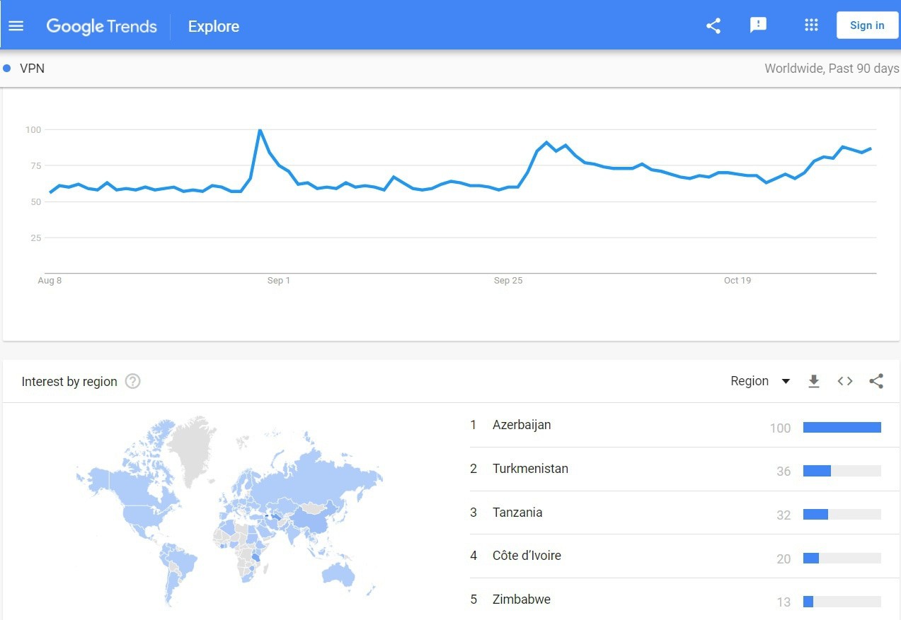 Действительно, рост интереса к VPN-сервисам в Азербайджане заметен и посредством объективных инструментов сплошного охвата (рост интереса лишь к одной платформе мог бы иметь техническую причину). В частности, по данным Google Trends в последние 90 дней Азербайджан с большим отрывом на первом месте в мире по интересу к VPN, на втором месте – предельно авторитарный Туркменистан, где этот интерес все же в три раза ниже.