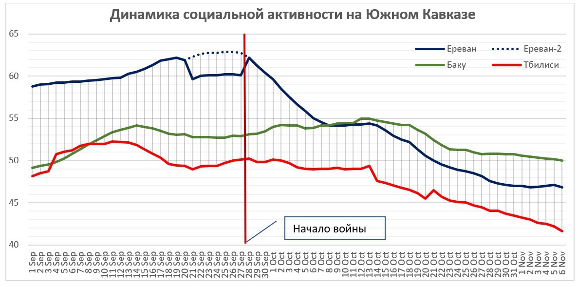 Как мы видим, в Ереване уровень социальной активности начал падать немедленно после начала войны, на Тбилиси эта война никак не повлияла (хотя с середины октября на фоне вспышки ковида в Грузии социальная активность быстро пошла вниз), а в Баку социальная активность начала расти, что могло бы быть вызвано именно ограничениями интернета и социальных сетей, в результате чего потребность людей в общении перешла в оффлайн.