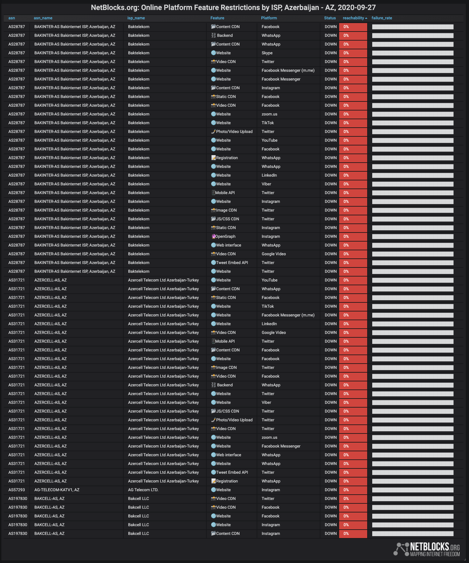 В самом начале Второй Карабахской войны распространилась информация о том, что в Азербайджане заблокировали социальные сети, в том числе Facebook, Instagram, Twitter, WhatsApp, YouTube, LinkedIn, Zoom, Skype. По словам министра связи, это сделали, «чтобы избежать провокаций со стороны Армении». Основным источником информации о блокировке выступил сайт Netblocks, продемонстрировавший блокировку следующей иллюстрацией.