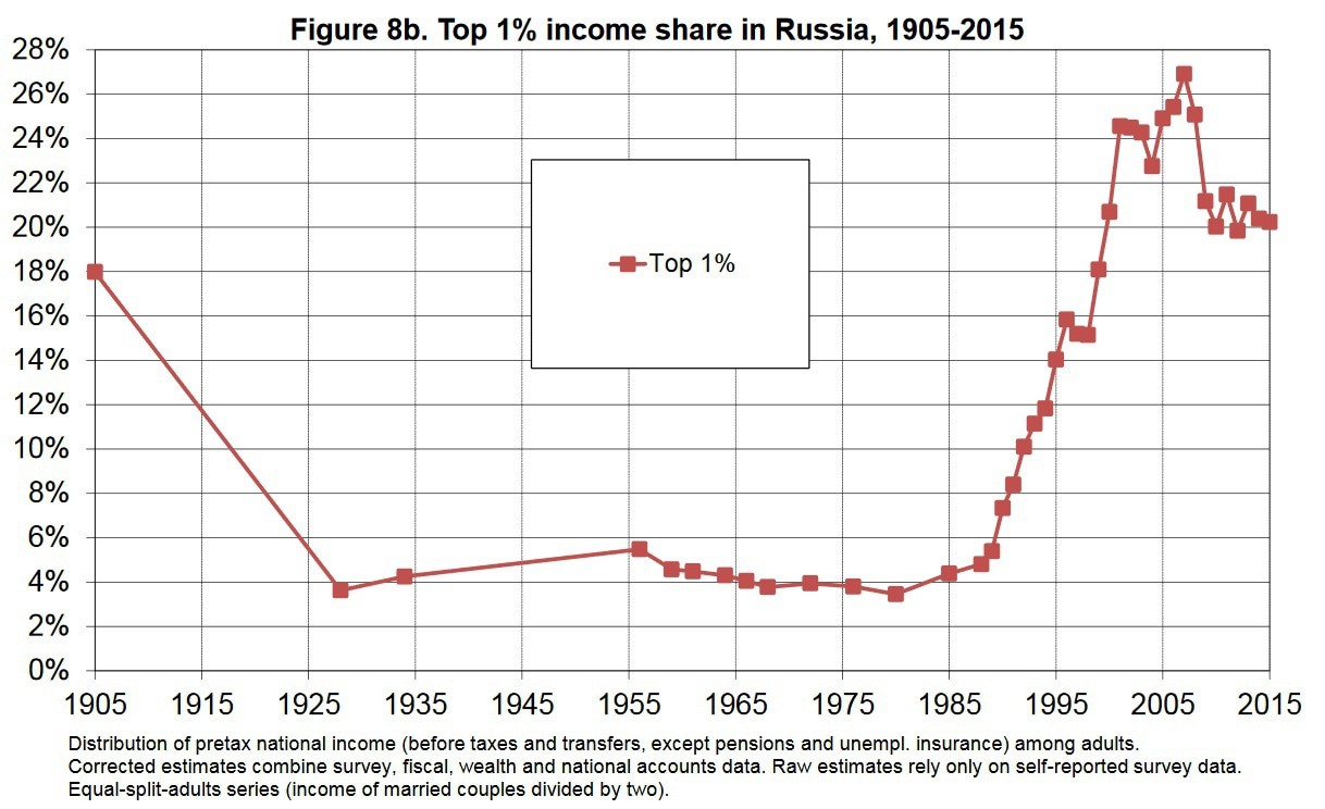 Динамика доли доходов 1% самых богатых в населении России, 1905-2015.