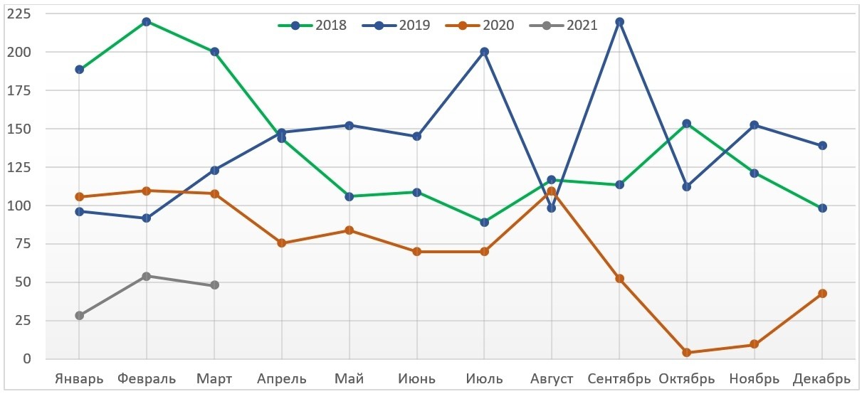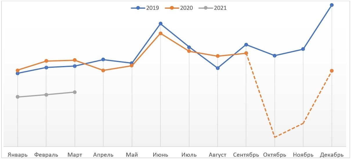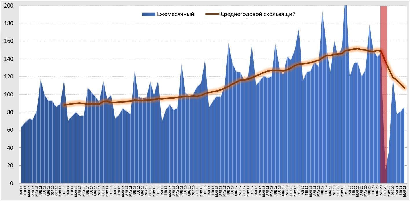 С начала октября началось резкое проседание экономики, которое еще не завершилось. Но судя по данным за начало 2021 года, мы можем примерно понять, о каком размере спада идет речь. В январе спад составлял 34.7%, в феврале 39.2%, в марте 37.3%, а в среднем за первые три месяца 37.1% к тому же периоду 2020 года или на 33% к соответствующему периоду 2019 года. Это соответствует примерно уровню за первый квартал 2015 года. Рассмотрим также картину за 2019-2021 гг.