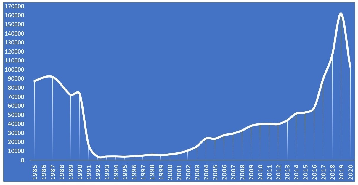 График 4. Динамика объема промышленного производства в постоянных ценах 2020 года, млн. драм., 1985-2020