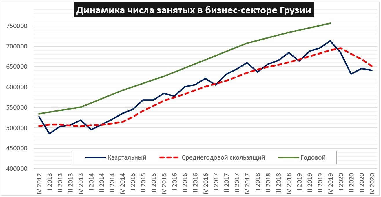 Еще одна причина – сокращение оборота предприятий. Бизнес-сектор Грузии, в значительной степени ориентированный на сферу услуг, сильно пострадал от карантина, закрытия границ и сокращения спроса на фоне кризиса. Как следствие, оборот компаний, платящих НДС, в июне 2020 года снизился на 6.2%, а с учетом инфляции – на 11.6% к тому же периоду предыдущего года; в декабре 2020 года с учетом снижения инфляции спад составил 7.3%. Опять же, представить аналогичное сокращение занятости нетрудно с одним изъятием – во многих странах мира предприниматели все же не торопятся сокращать сотрудников, чтобы не увеличивать социальную нагрузку, также играет роль и человеческий фактор. В Грузии это куда меньше выражено, поскольку в Грузии очень либеральное трудовое законодательство, составленное в целом в пользу работодателей. См. также: Обратная сторона дебюрократизации. Рост смертности на рабочих местах в Грузии (10 октября 2018). В последние годы происходил постепенный пересмотр этого в пользу расширений прав работников, но как предполагается, там есть еще довольно большие резервы.