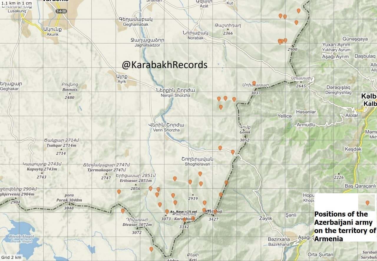 Ниже - карты, представленные Тароном Ованнисяном из центра "Karabakh Records" на основании данных армянской стороны. На первой карте отмечено расположение азербайджанских постов (фиолетовым) на конец мая 2021 года.