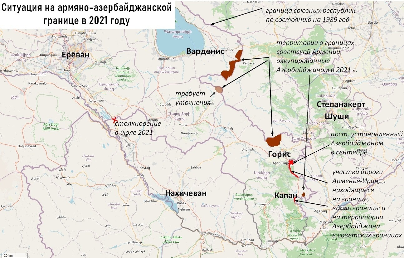 Сентябрь 2021 – Азербайджан установил пограничный пост на дороге Горис-Капан, на том участке, который попадает в пределы границ советского Азербайджана, а также начались задержания иранских водителей, штрафы, запреты и так далее. Это привело к серьезному напряжению между Азербайджаном и Ираном, были проведены учения по обе стороны границы и острые заявления с иранской стороны. По словам Пашиняна, это связано с требованиями Азербайджана предоставления ему коридора через территорию Армении, что азербайджанские власти пока так и не получили. Это похоже на правду, хотя и не всю: Азербайджан также хочет признания новых границ и уточнения существующих в свою пользу в рамках процесса делимитации границы.