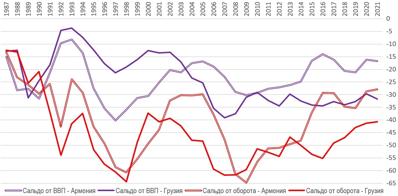 Как мы видим, в этом сравнении у Армении все же не такой значительный отрицательный баланс внешней торговли, не говоря уже о том, что в последние 15 лет в экспорте Грузии присутствует и реэкспорт автомобилей, что несколько смещает баланс в положительную сторону. При этом, и в Армении, и в Грузии мы видим примерно одинаковые тенденции на протяжении всего периода, что говорит о том, что экономики стран все еще довольно похожи, испытывали влияние тех же объективных факторов, хотя справлялись с этим влиянием и по-разному.