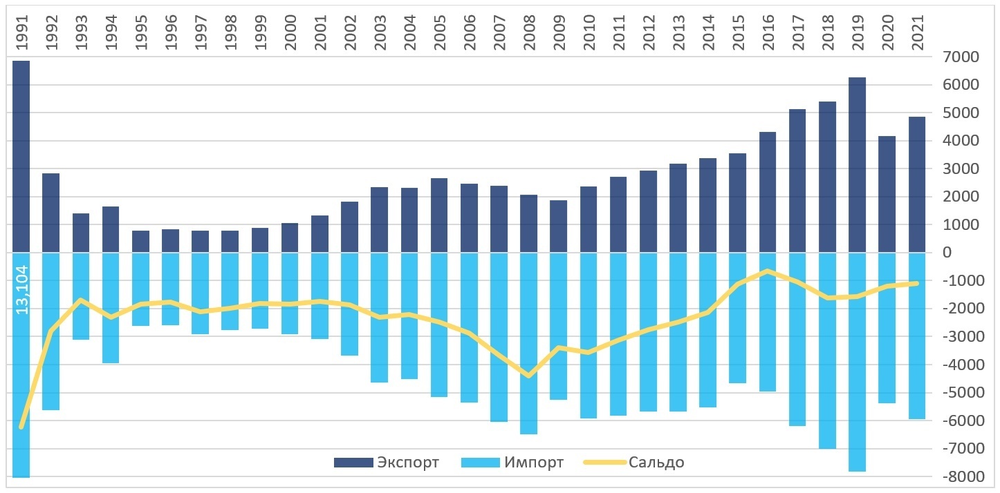 Изменился характер внешней торговли и сравнивать напрямую с советским периодом не всегда продуктивно. Так, в графике 1 представлены мои оценки внешней торговли на основании советских данных. В 1987 году межреспубликанский вывоз Армении составлял 4.05 млрд долл. рублей во внутренних ценах, и еще 43 млн инвалютных рублей экспорт из Армении за пределы СССР, то есть номинально экспорт составлял 4.1 млрд рублей, что соответствует 2,635 млн долл. в тогдашних ценах или 6,285 млн долл. в ценах 2021 году. Импорт в том же 1987 году составлял 316.5 млн инвалютных рублей в текущих ценах и 3,490 млн внутренних рублей составлял межреспубликанский ввоз, итого, импорт, по моей оценке, составлял 3.44 млрд долл. в тогдашних ценах или 8.213 млрд долл. в ценах 2021 года.
