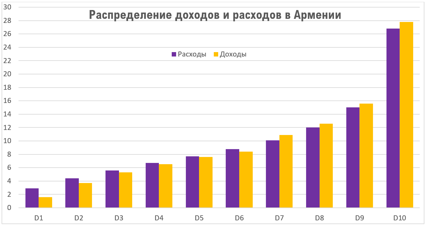Уровень неравенства чаще всего выражается в коэффициенте Gini, который отражает общий уровень неравенства распределения в стране. В Армении рассчитывают неравенство по доходам и по расходам. Кроме индекса Gini, рассчитывают также долю отдельных групп в потреблении по процентам, по децилям (10%-ные группы) и по квинтилям (20%-ные группы). В Армении такие распределения доступны за период начиная с 1996 года. Взглянем на распределение доходов и расходов по децилям в 2019 году (в 2020 году на фоне кризиса ситуация несколько исказилась).