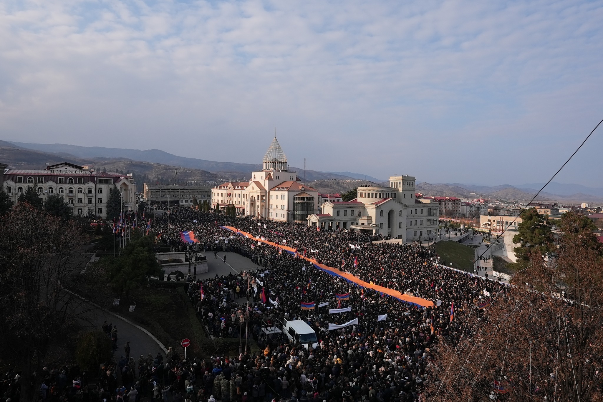 Вчерашний митинг (25 декабря 2022 года) был тоже очень массовым, но число участников было несколько меньше, судя по фотографиям, снятым с высоты, так что была ниже плотность и границы толпы. Это объяснимо, так как из-за нехватки топлива движение по республике затруднено и многие арцахцы из районов не смогли приехать в Степанакерт для участия в акции. Тем не менее, по фотографиям акция была более чем впечатляющая с вероятным числом участников от 35 до 38 тысяч человек. Основным требованием было открыть дорогу жизни немедленно и безо всяких предусловий.