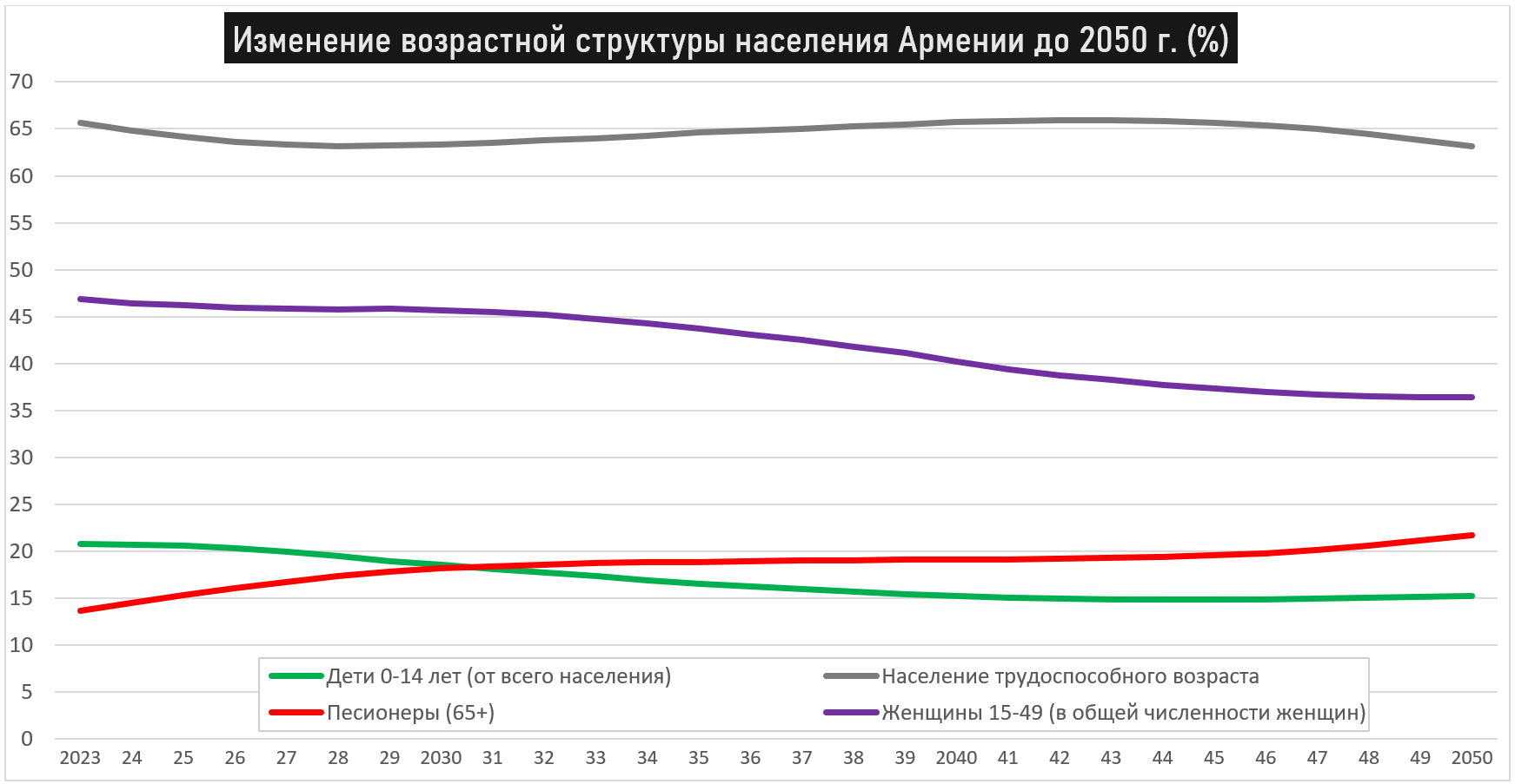 С 2032 года число пенсионеров превысит число детей, что лишь подчеркнет процесс старения населения, идущий в Армении довольно быстро. Спад рождаемости при одновременном, на первых порах, медленном росте числа людей старшего возраста, приводит к росту доли населения в трудоспособном возрасте и снижению доли иждивенцев (демографический термин) во всем населении. Это означает, в свою очередь, что складываются наиболее благоприятные условия для экономического роста, в специальной литературе это называется «демографический дивиденд». Но снижение доли детей чаще всего происходит параллельно росту доли людей в старших возрастах и «окно» демографического дивиденда закрывается. Армения имела этот дивиденд в 2000-2010х гг., а уже с 2020-ых гг. доля населения в трудоспособном возрасте сокращается. Впрочем, в дальнейшем она стабилизируется и восстановит рост на фоне продолжающегося снижения доли детей, а системный и долгосрочный спад начнется, по моему прогнозу, лишь с 2045 года. Так что опасения, что возрастная структура обвалит экономический рост, не обоснованы. Однако это не означает, что беспочвенны и опасения, что пенсионеров будет нечем кормить по причине быстрого роста числа самих пенсионеров в период до 2032 года.