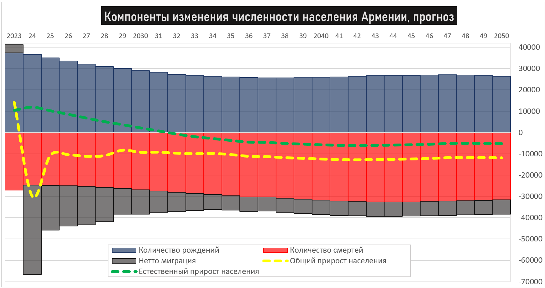 Я взял за основу тот факт, что в среднем за период 2002-2021 гг. сальдо внешней миграции населения Армении составляло -17.5 тыс. чел. (если за таковое принимать чистую разницу пересечений границы). Очевидно, что в будущем по мере роста доходов населения и уменьшения относительной разницы с развитыми странами, выталкивающие силы будут уменьшаться и можно предполагать снижение эмиграции на перспективу. После отъезда большей части прибывших в 2022 году (предположительно в 2024-5 гг.), ожидаемый уровень эмиграции будет сокращаться с 18 тыс. в год до 6.7 тыс. (2035-2050), так что я предполагаю более существенную эмиграцию, чем эксперты ООН (которые почти всегда миграцию недооценивают).