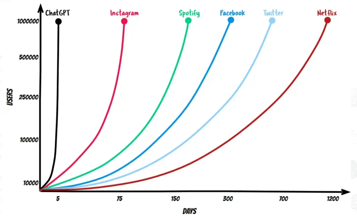 Во мне сработал стадный «инстинкт», и я решил не отставать от толпы и ознакомиться с тем, что же так заинтересовало людей. Кстати, для понимания скорости распространения этого чата, можно оценить экспоненты роста распространенности по сравнению с другими продуктами.