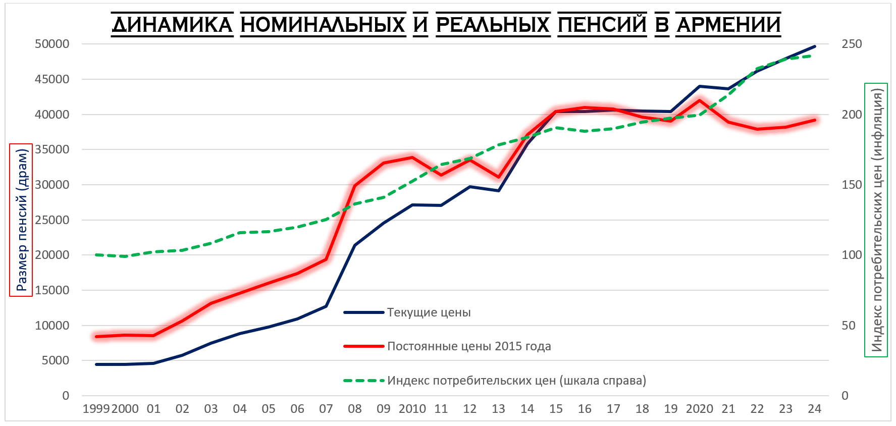 Выше уже было показано, что «рост» пенсий в последние годы, в частности, в период премьерства Пашиняна, нельзя даже считать индексацией инфляции, и в реальности покупательная способность пенсий сокращалась. Но это не все. Экономика же в этот самый период росла. См. также: Экономика Армении выросла на 12.6% в 2022 году. Причины (22 февраля 2023). Рост в экономике фиксировался не каждый год (в 2020 был спад), но в целом за период 2018-22 гг. ВВП вырос на 25%, а с учетом нынешних темпов роста, за 2018-24 гг. накопленный рост достигнет 42%, с исключением инфляционных факторов. Почему же реальный размер пенсии за тот же период лишь уменьшается?