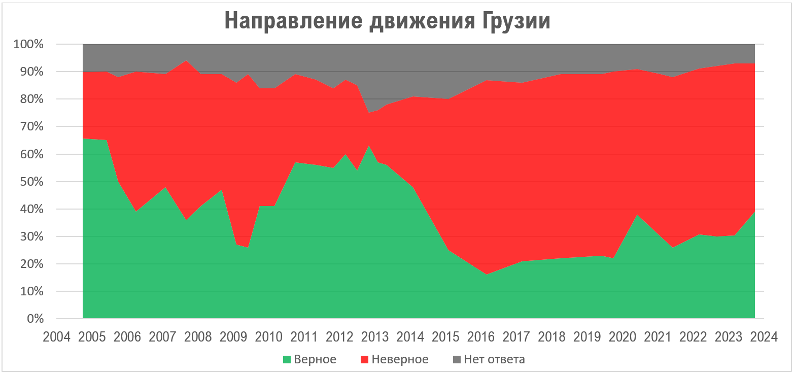 График 3. Оценка направления развития ситуации в стране, Грузия, 2004-2023 (по данным опросов IRI)