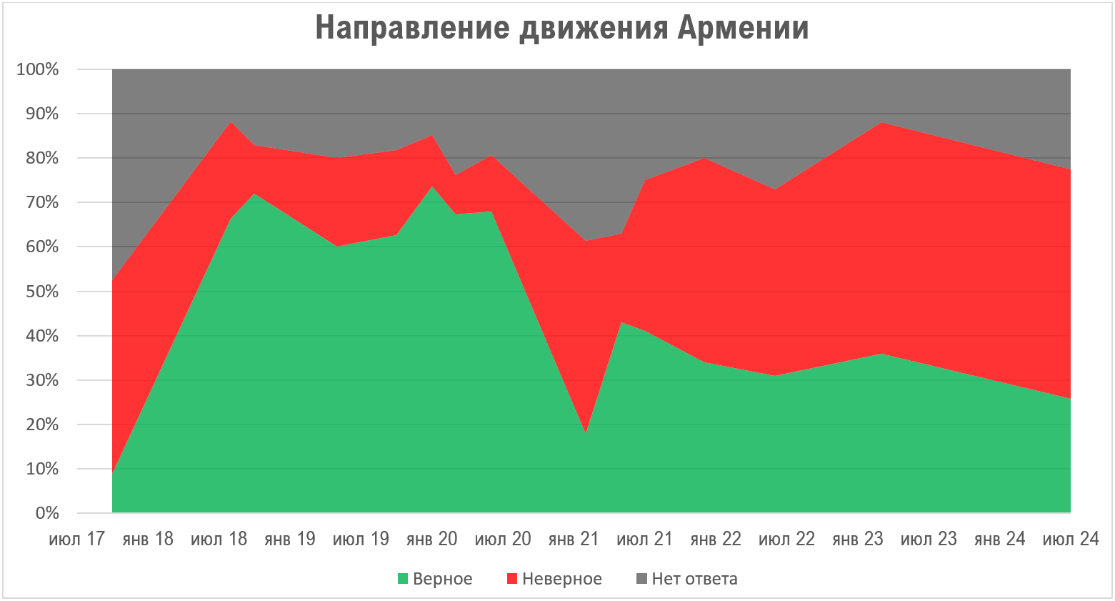 В Армении экономическая ситуация достаточно хорошая – ВВП в 2024 году растет достаточно уверенно – на 6.5% в первые полгода при 8% в 2023 и более 12% в 2022. Несмотря на это, большинство ответило, что направление движения неверное. Верным направление считали 25.8%, неверным – 51.6%. Многие не имеют определенного мнения. Очевидно, что в данном случае люди в качестве приоритета выбрали внешнеполитическую ситуацию, ситуацию на границе и ситуацию в сфере безопасности, а не экономику, а точнее хорошая экономическая ситуация не сумела переломить общее негативное восприятие политики.