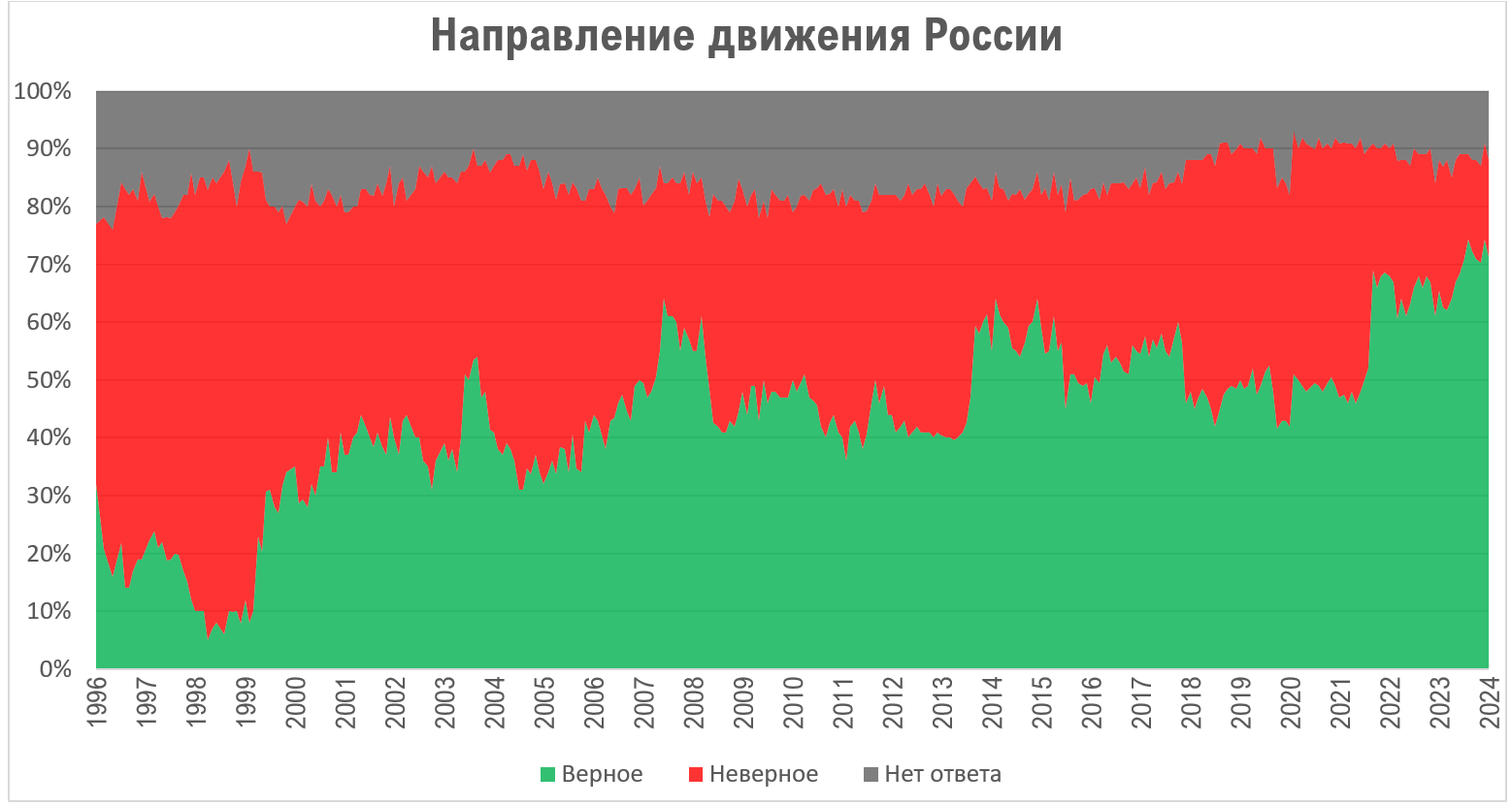 График 4. Динамика оценок направления развития ситуации в стране, Россия, 1996-2024