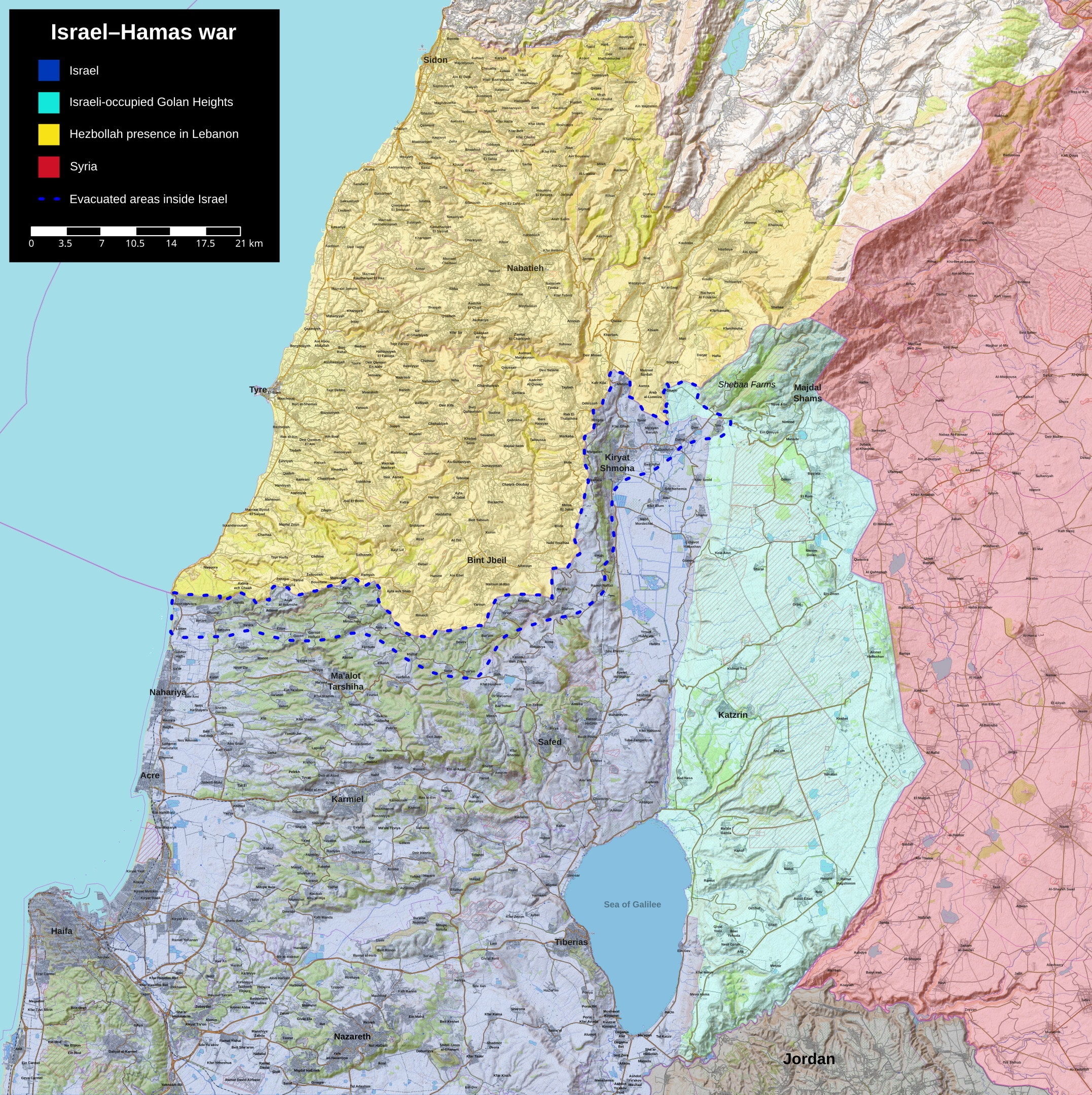 Карта пограничной зоны между Израилем и Ливаном. Синим цветом отмечена территория Израиля, голубым – оккупированные Голанские высоты, находящиеся под контролем Израиля, а желтым – юг территории Ливана, где влияние «Хезболлы» максимально. Остальная часть Ливана отмечена белым цветом. Также на карте синим пунктиром отмечена зона эвакуации гражданского населения Израиля.