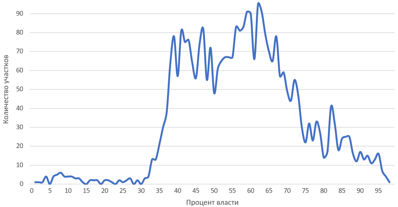 График 1. Распределение участков в Грузии по количеству голосов за правящую «Грузинскую мечту»