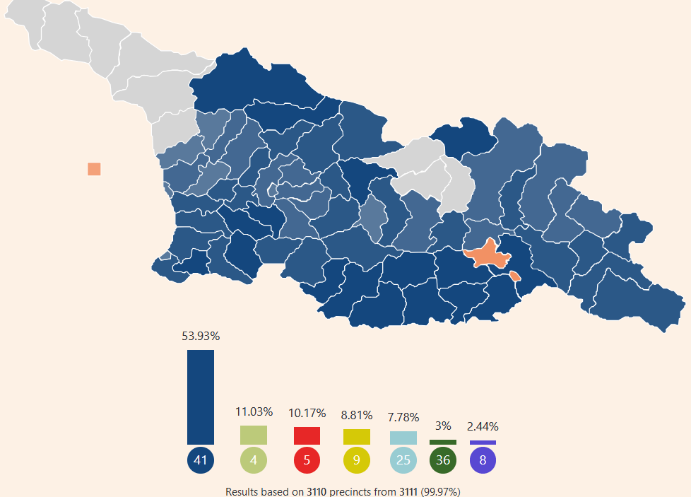 Как мы видим, на территории большей части страны победила "Грузинская мечта". Оппозиция - подписанты "Грузинской хартии" Зурабишвили, совместно победили власть только в Тбилиси и Рустави. Ниже - карта Civil.ge распределения голосов по регионам.