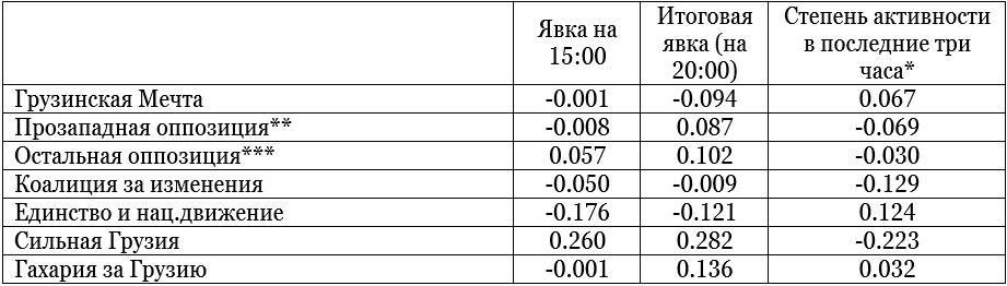 Как мы видим, в качестве наиболее явной оппозиции власти выступала «Коалиция за изменения», а также «Гахария за Грузию», но похожий паттерн фиксировался и у других субъектов за исключением «Национального движения», у которого паттерн голосования относительно больше похож на власть и минимально пересекается с другими субъектами. Кстати, даже не прозападная оппозиция, такая как «Лейбористы» и «Альянс патриотов», фиксировали выраженную отрицательную корреляцию с голосами за власть, что говорит о том, что характер голосования за власть отличался от голосования за оппозицию – и если в первом случае важную роль сыграли организационные факторы, то во втором – идеологические. Именно это сближает все оппозиционные партии вне зависимости от их политической ориентации.
