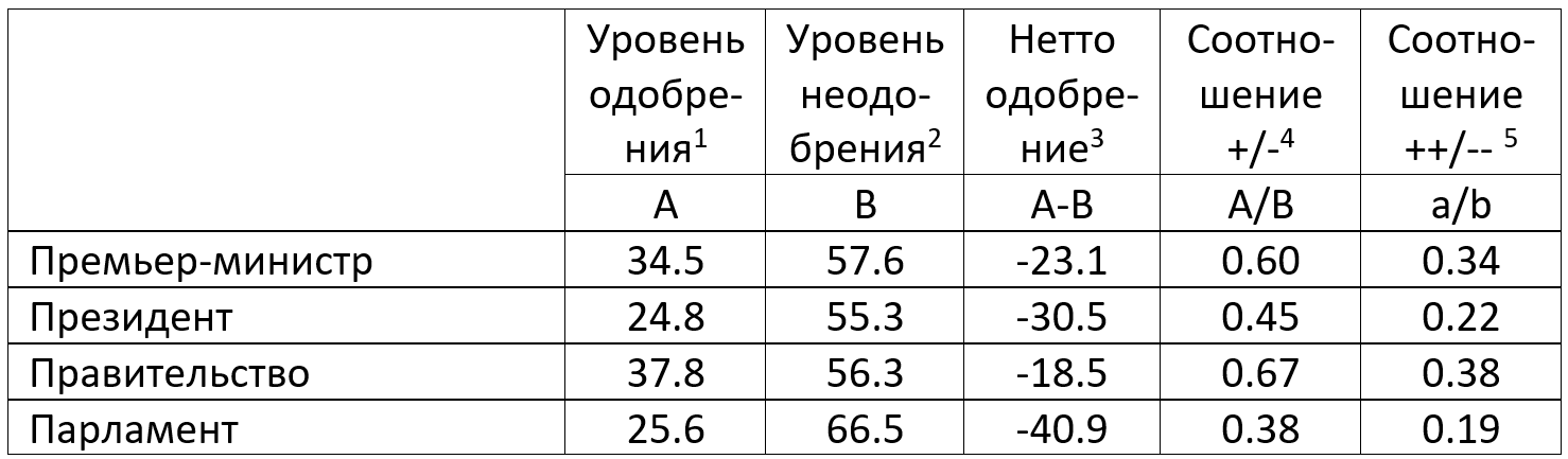 Одним из главных замеров в регулярной практике проведения соцопросов является уровень доверия государственным и политическим институтам. Порой это довольно трудно отделить от доверия лицам, возглавляющим эти институты, таким образом это превращается в малый референдум о доверии власть предержащим. В данном опросе вопрос был сформулирован по-другому: «Как вы оцениваете работу нижеперечисленных», таким образом, от опрашиваемых требовалась собственная, в какой-то степени экспертная, оценка. По всем опросам уровень одобрения действий власти был надежно ниже 50%, а уровень неодобрения – надежно выше 50%. Строго говоря, это не одно и то же, что и уровень поддержки. К примеру, гражданин может считать, что тот или иной политик не справляется с работой, показывает плохой результат, но в то же время, этот политик может нравиться этому избирателю из эстетических или каких-то других соображений и в результате за него проголосуют. Рассмотрим показатели основных политических институтов.
