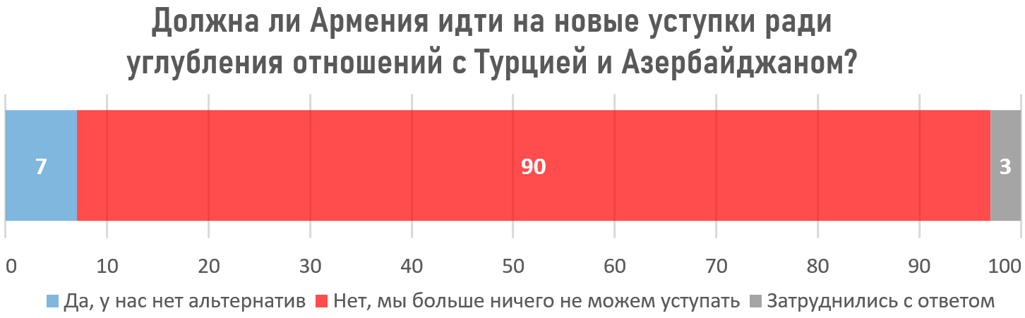 Перейдем к содержанию. Следующий вопрос касается того, должна ли Армения идти на новые уступки ради установления более близких отношений с Турцией и Азербайджаном? Позиция тех же властей однозначная – можно и нужно делать все, что возможно ради этого. Известно, что эта позиция непопулярна, но насколько? На данный момент лишь 7% согласны на такие уступки, а 90% - считают, что Армении больше нечего уступать.