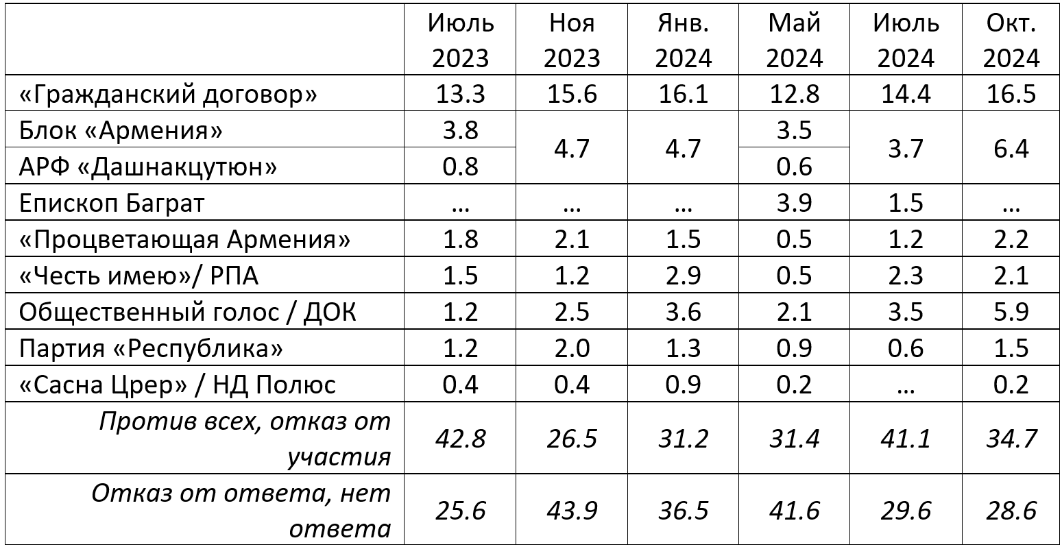 Рейтинг правящей партии осенью продолжал восстановление к уровню начала года, тогда как епископа Баграта избиратели перестали воспринимать в качестве реального политического лидера, а его потенциальные голоса перераспределились между партией «ДОК» и блоком «Армения». Сократилось количество неопределившихся избирателей. Рейтинг политических партий (при условии, что выборы прошли бы в ближайшее воскресенье), выглядит так: