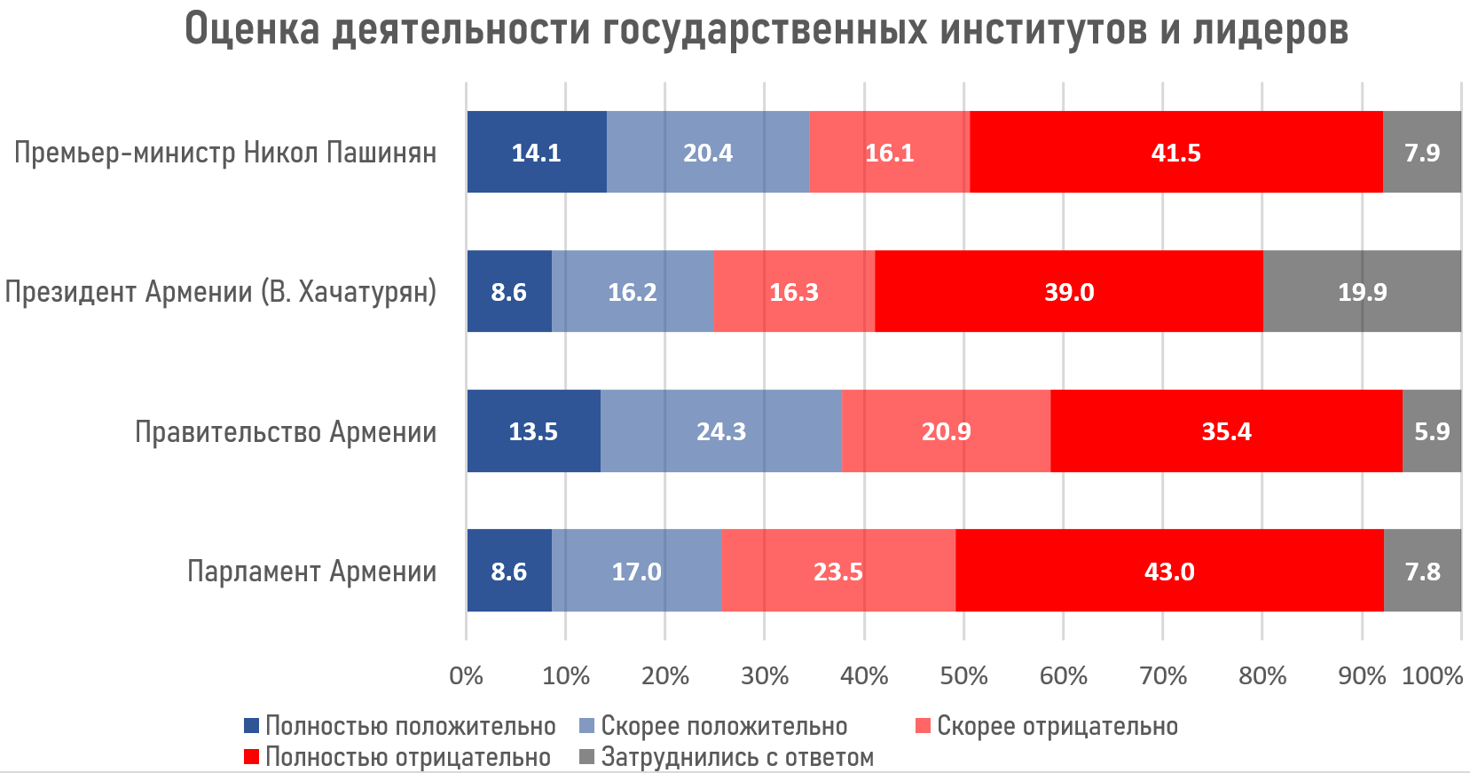 Начну с политического фона. Опрос проводится на фоне стабилизации внутриполитического положения, провале оппозиционного движения «Тавуш во имя Родины», а также активных попыток власти договориться с Азербайджаном. Эти попытки никаких успехов не принесли, но постоянно приносят новые потери и подтачивают легитимность власти. При этом, экономическое положение страны довольно хорошее на фоне трех лет высокого роста, вызванного, среди прочего, новой посреднической ролью Армении, востребованной на фоне геополитической напряженности в евразийском регионе.