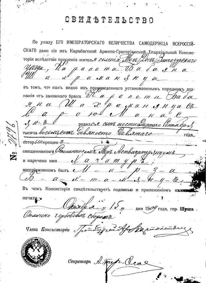 После резни армян в Шуши в марте 1920 года, почти все армянские дома сгорели. Кто успел спастись, думал о своей жизни, а не о документах, поэтому и осталось так мало документальных свидетельств о проживавших в Шуши армянах. Семье Шахраманянц удалось спастись и документы остались. Сейчас представители этой семьи проживают и в Степанакерте, и в Москве, и в Лионе, и в Глендейле...