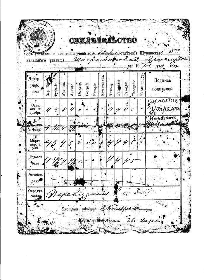 дореволюционный аттестат дочери Карапета, Аршалуйс