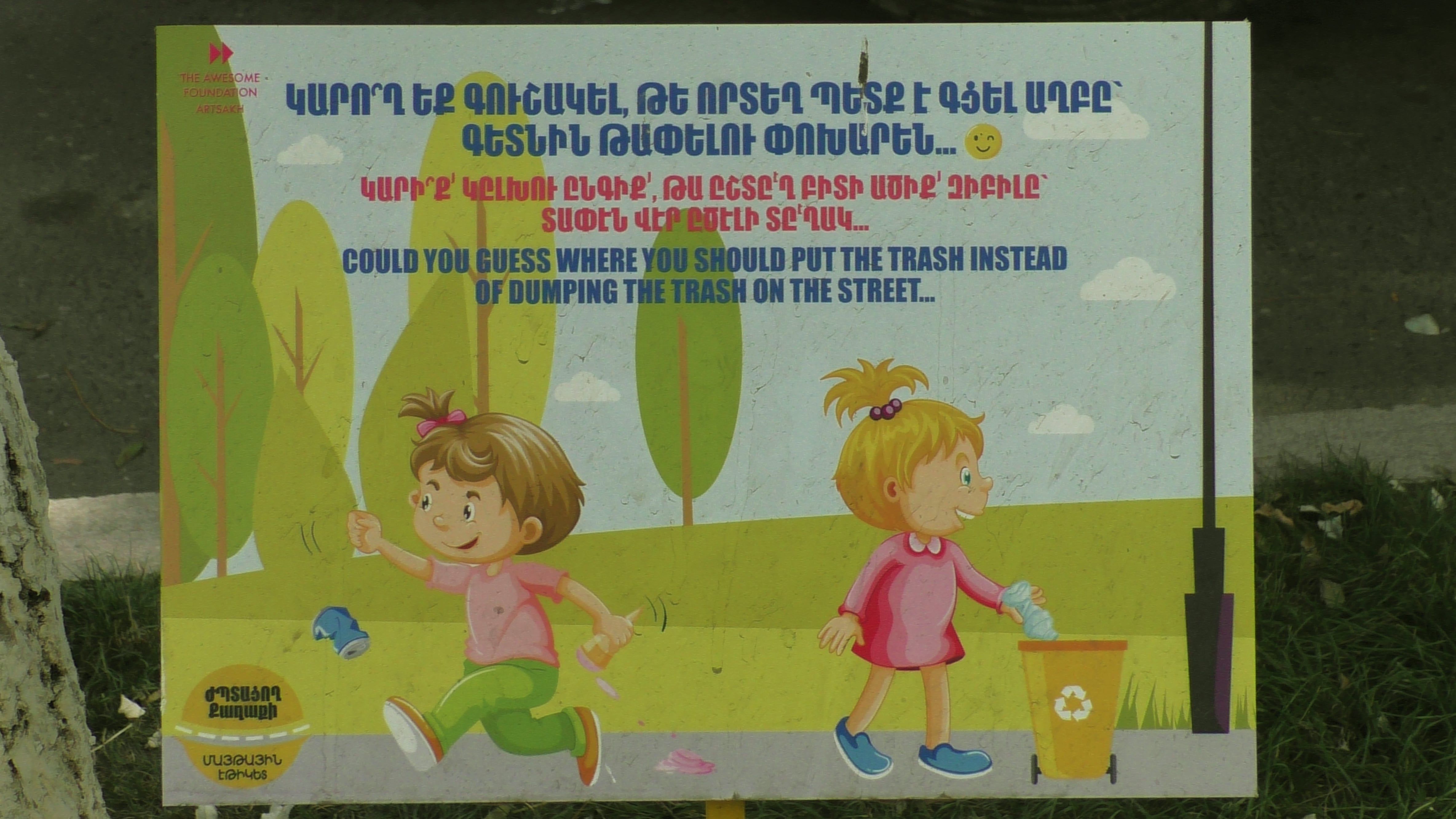 "Догадайтесь сами, куда надо бросать мусор, надо не на улицу, а в урну". Чистота, как говорится, залог здоровья, в Степанакерте если выбросишь на улицу, кто-то может подойти и сделать замечание, потому наш город и славится своей чистотой, хотя и нерях хватает...