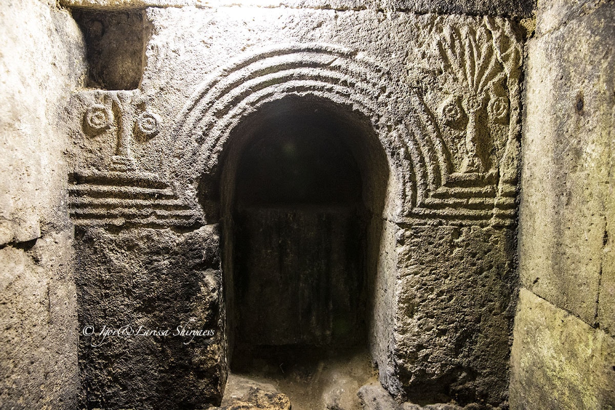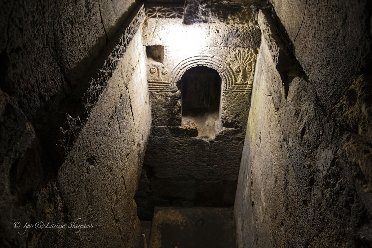 Сам Амарасский монастырь неоднократно уничтожался, но вот его подвал - усыпальница Григориса, внука Григория Просветителя, сохранился еще с древнейших времен. Возможно, каждый раз, когда рушили главную церковь, обломки камней ссыпались в подвал и это его спасало. Сохранилась и каменная лестница, ведущая в эту усыпальницу, а еще сохранился орнамент на стене. Он очень похож на лучики золотого украшения из Грузии. Можете сравнить эти два узора.
