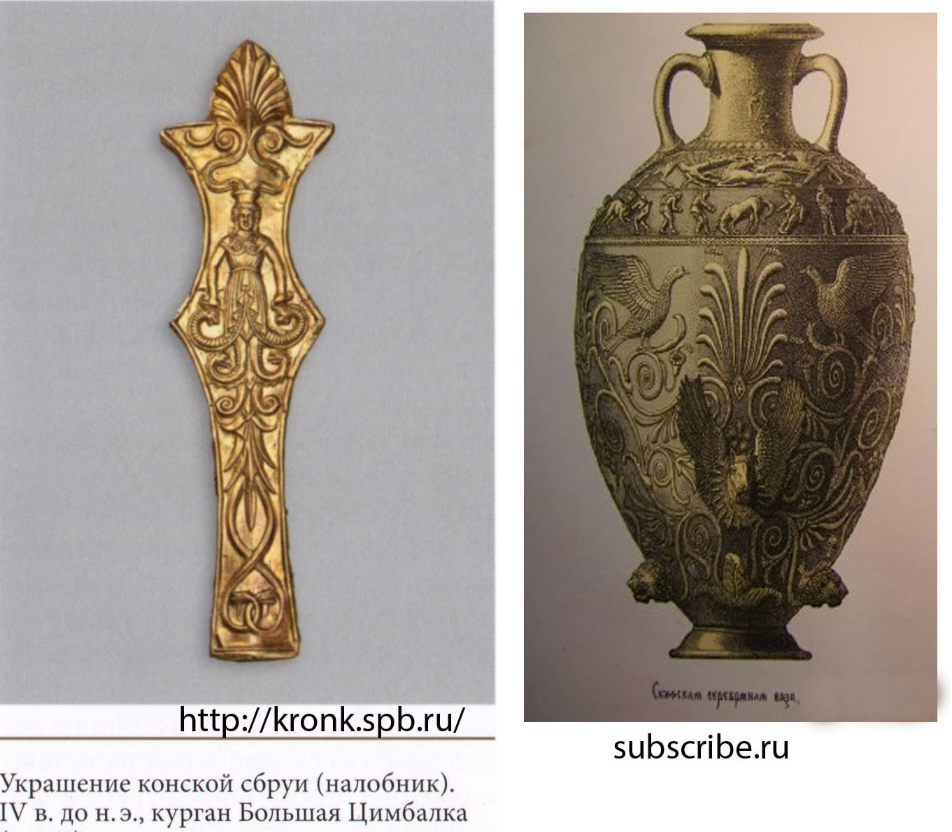 Похоже на дерево, не правда ли. Может поэтому христиане его и не стерли, ассоциируя с древом познания. Орнамент очень древний, называется пальметта, встречается и на других древних экспонатах, вот еще два скифских примера, на навершии, как корона для богини и по центру амфоры.