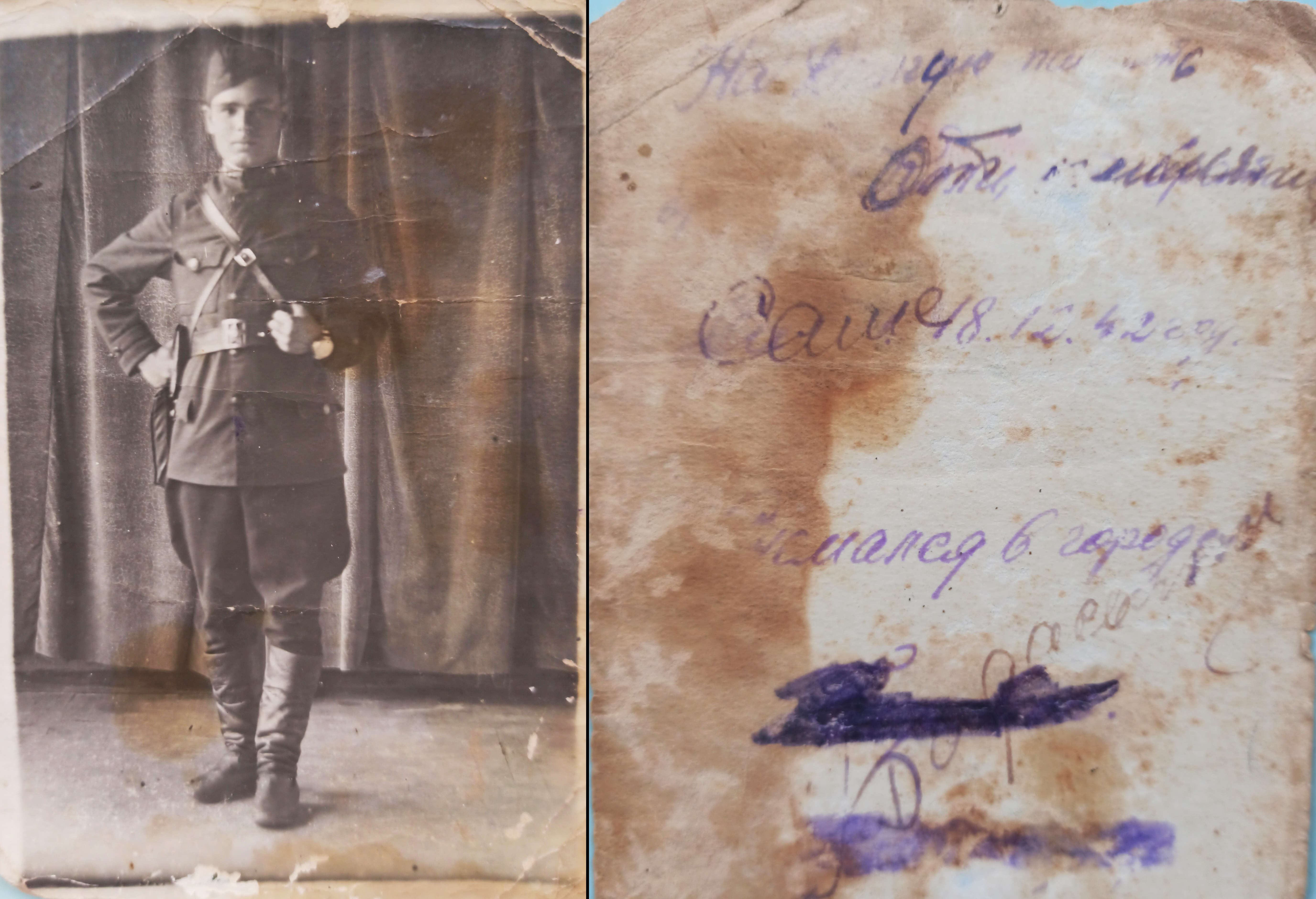 На обороте фото читается дата 18 декабря 1942 г. Интересно, что у Саши на правой руке - часы или компас?