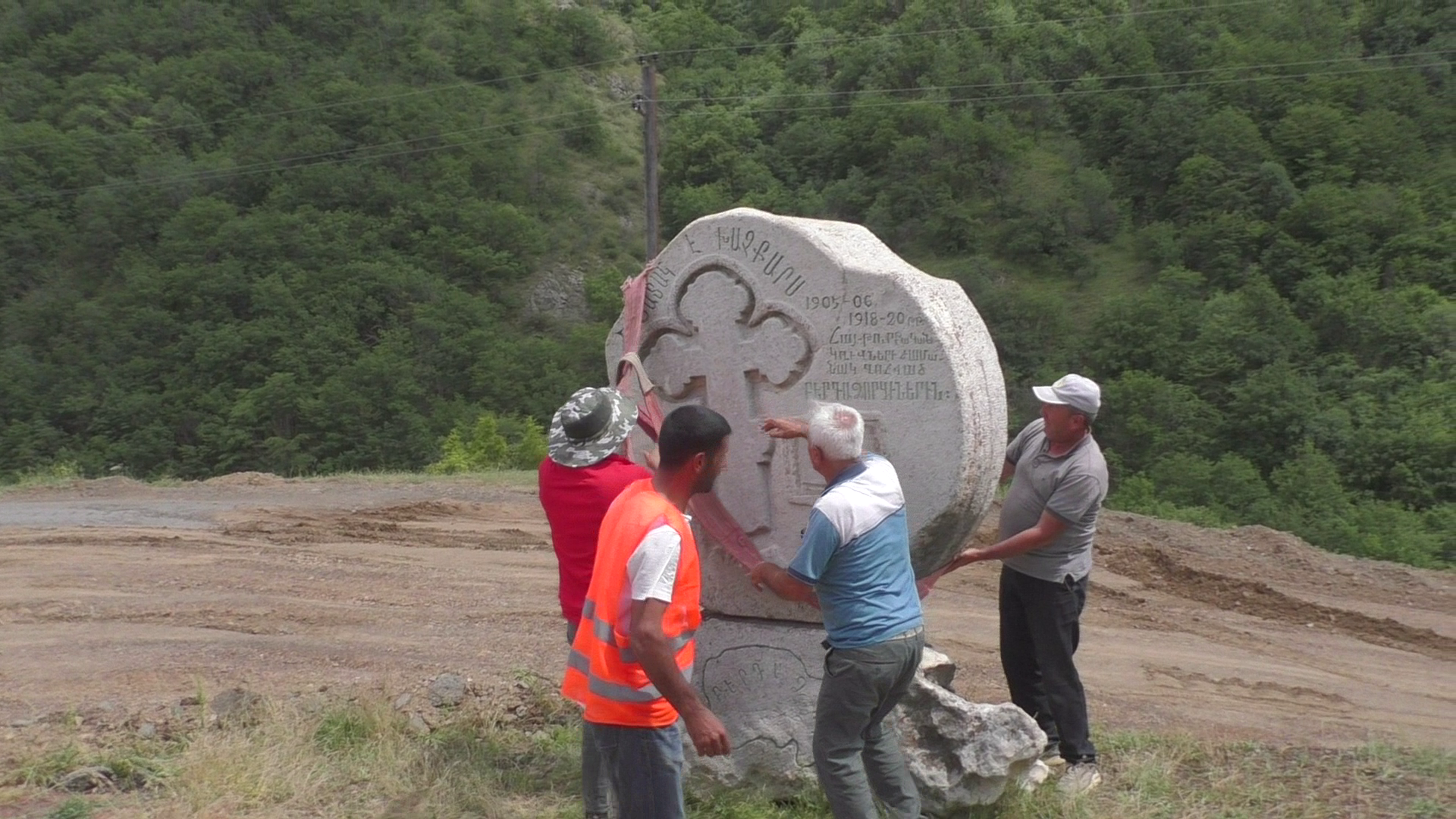 Азербайджанцы обвязали Хачкар ремнем и отодвинули на противоположную сторону.