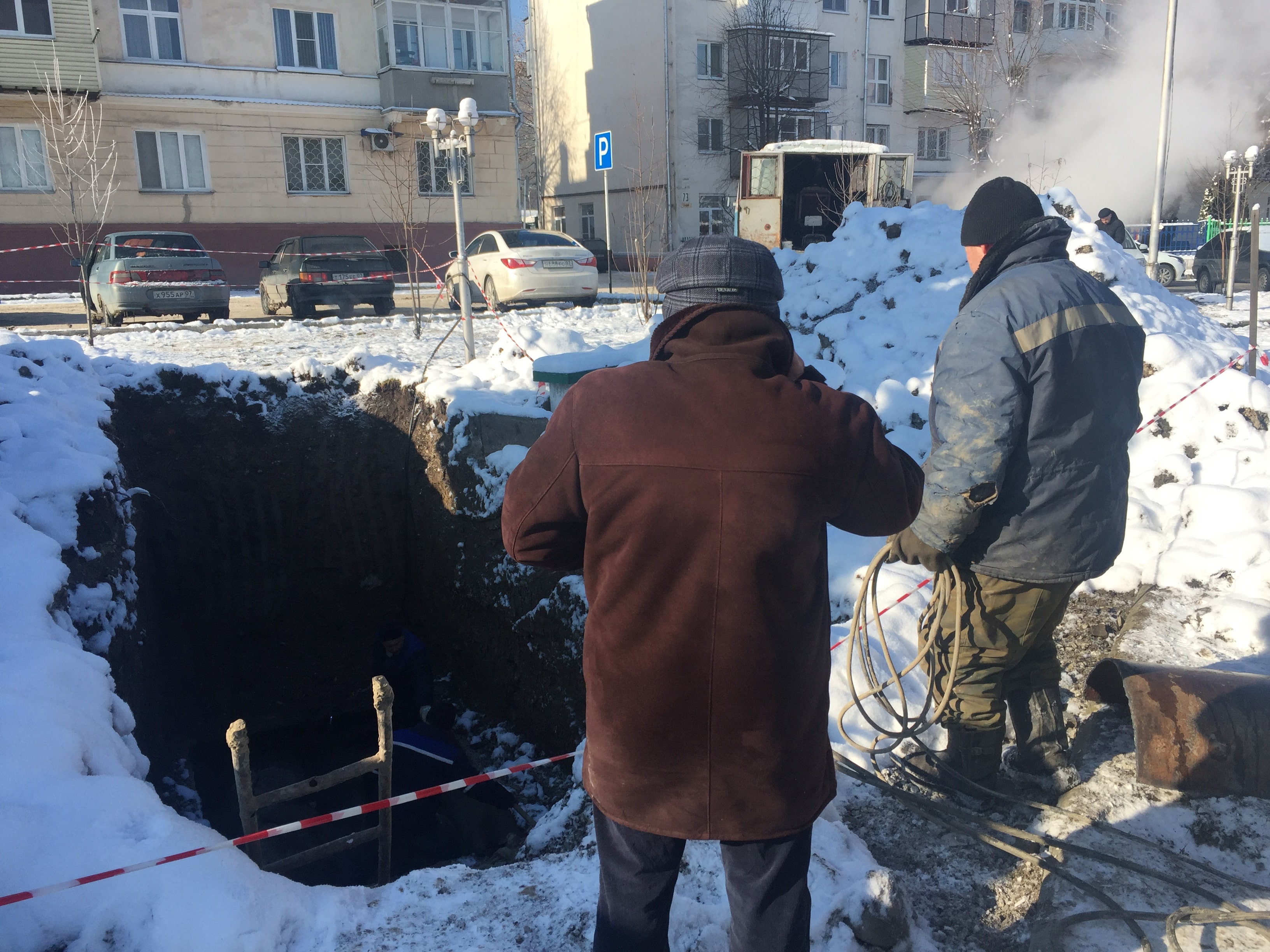 Так, сегодня  в сквере на углу  улицы Осетинская и проспекта  Ленина вырыта большая яма. В яме находятся  рабочие, один просит лопату, ему скинули лопату. Яма глубиной  в 3-4 метра. Там огромная труба. Мне жаль этих рабочих, которые работают в таких грязных условиях.  Вот если бы чиновники, от которых  зависит вопрос, обращали  на это особое внимание и на то, что в наших домах мерзнут и дети тоже,  они бы сумели  найти  выход из положения…