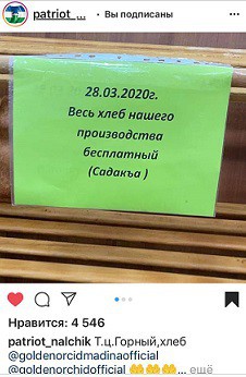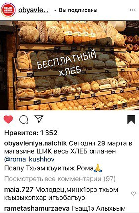 Нальчанин  Роман Кушхов  оплатил весь хлеб, который имелся в продаже в магазине «Шик», чтобы посетители магазина могли его взять бесплатно. А торговый  центр  «Горный»  часть выпеченного  в  собственной пекарне хлеба ежедневно раздает  бесплатно.