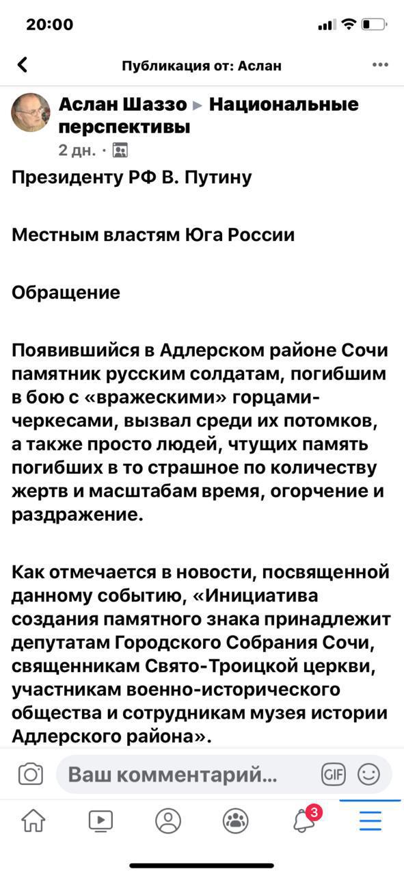 Поводом для обращения послужила установка очередного памятного знака в Адлере 30 июня.  «Монумент подвигу русских солдат» установлен на месте развалин крепости, заложенной в 1837 году. В сообщении администрации города было указано (позже запись удалили):