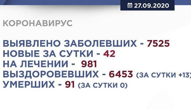 По данным Оперативного штаба КБР, на 27 сентября количество заболевших – 7525 человека, новых за сутки – 42, на лечении - 981, выздоровевших 6453 (за сутки 13), умерших -91. Минздрав рекомендует в общественных местах носить маски, воздерживаться от посещения массовых мероприятий и соблюдать дистанцию.