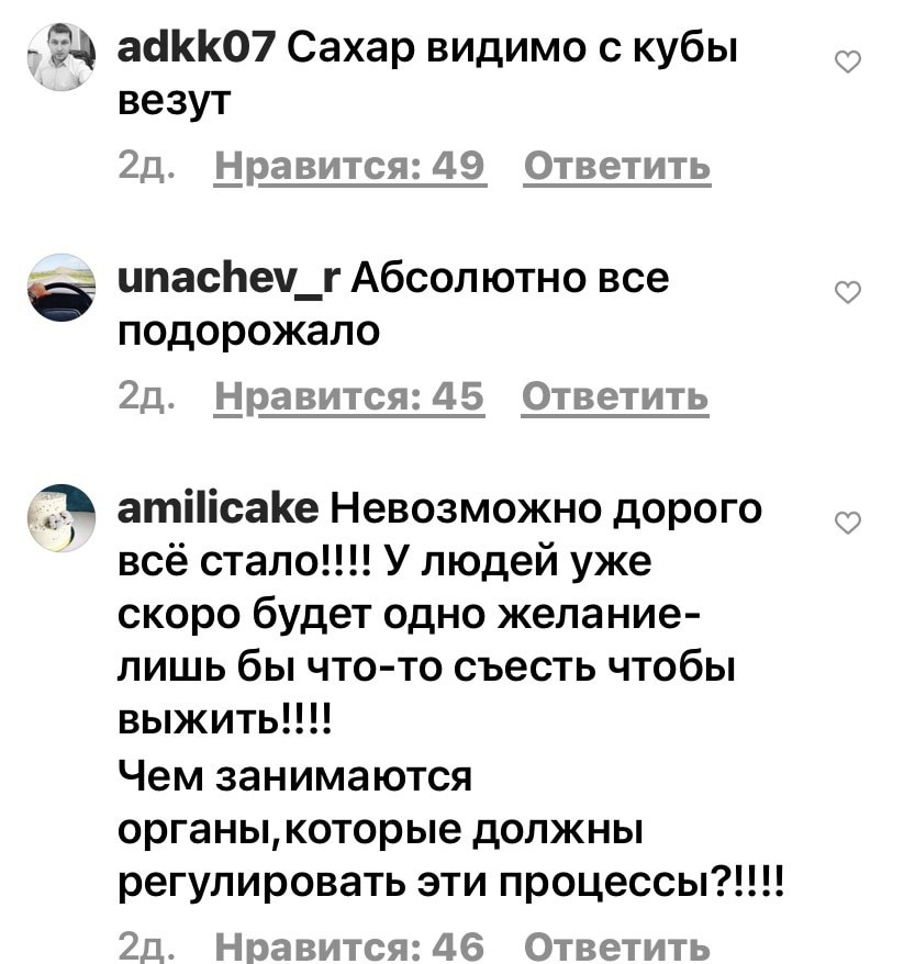 Пользователи подвергли критике сообщение Минпромэнерготорга республики  о том, что речь идет о сезонном повышении цен, и что оно незначительное. В ответ на это пользователи сопоставляют старые и новые цены на конкретные продукты. В частности, они указывают, что, например, сахар стоил  32 рубля, а теперь -  59, цена на отдельные наименования растительного  масла  выросла  с 84 до 120 рублей,  молоко  с 55 и  до 66 рублей за литр,  участники обсуждения подчеркивают,  что речь не идет о нескольких рублях, разница в ценах весьма существенная и ощутимо бьет по карману.