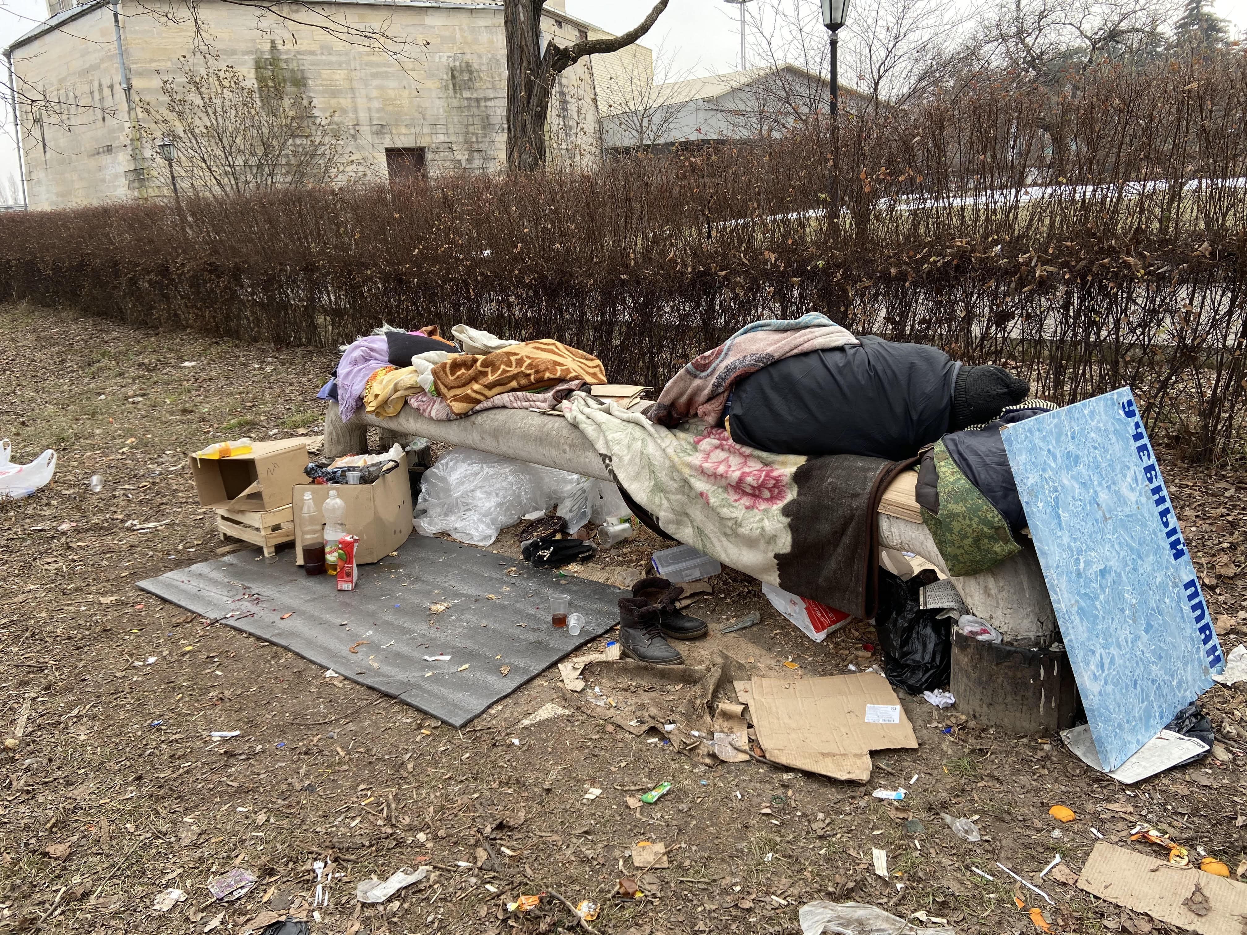 Мужчину мы застали спящим на трубе теплотрассы между зданием медицинского факультета и Арт-центром Мадины Саральп. Женщин на месте не оказалось. Вокруг были разбросаны тряпки, одеяла и другие следы жизнедеятельности человека. Напротив теплотрассы стояла прислонённая к ограде наряженная елка.
