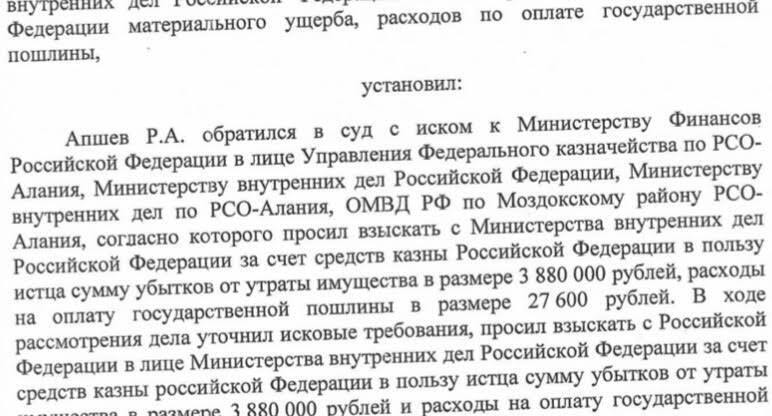 Суд первой инстанции и апелляционный суд РСО- Алании отказали ему в удовлетворении иска, который он адресовал МВД России, и его структурам в  РСО-Алании, ибо автомобиль у него забрал дознаватель Моздокского РОВД.
