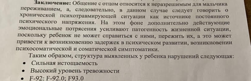 Заключение психолога подтверждает наличие у мальчика переживаний, связанных с отцом.  Имеется также направление невропатолога на лечение ребенка в реабилитационном отделении.