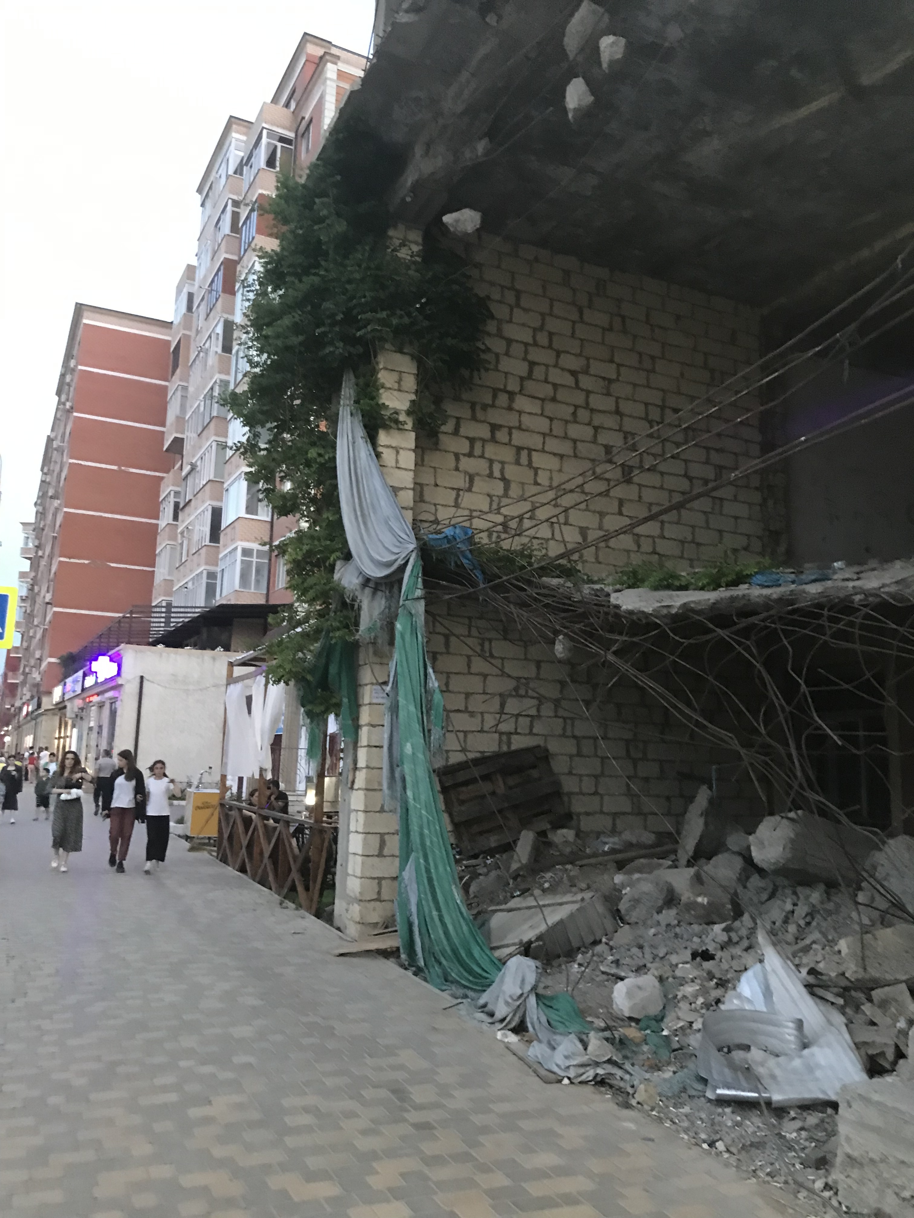 Из крепости в город ведет длинная лестница, вдоль которой есть парочка кафешек. Вообще мне не очень везло с кафе в Дербенте, но вот как раз на лестнице есть классное место, где владелец наливает гостям чай чуть ли не через голову себе, называя это аэрацией. Атмосферное место с цветущими гранатами и инжирами.